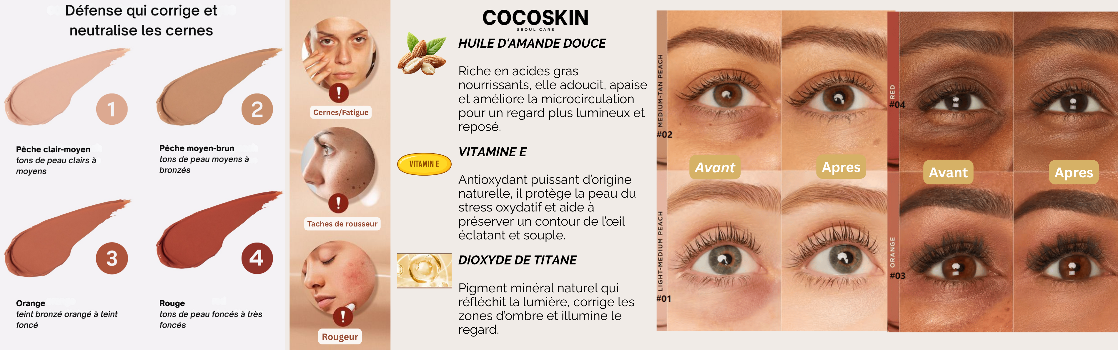 CocoSkin agit comme une lumière douce sous vos yeux : il corrige les ombres, atténue les marques du quotidien et révèle un regard reposé, frais, vivant. -